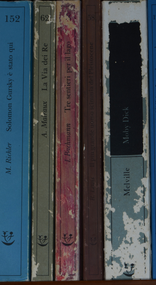 Clickie ha scritto: Cito da un delizioso libriccino che sicuramente conoscete, "Il più grande uomo scimmia del pleistocene" di Roy Lewis. Ottima lettura. "Uno dei più divertenti libri degli ultimi cinquecentomila anni", afferma giustamente Terry Pratchett nella presentazione. Lo consiglio a tutti quelli che non l'hanno letto. Disquisizione entomologica (del resto, siamo entomologi). La collana di Adelphi nel quale è inserito il mio esemplare, "FABULA", ha la copertina di un cartoncino poroso e ruvido, gustoso e saporito a detta di tutti i Lepisma saccharina, i quali, di conseguenza, ne fanno strage. Volumi di altri editori, o altre collane di Adelphi, passano attraverso i decenni indenni, ma questi sono massacrati dai maledetti "pesciolini". Solo i "Sellerio" piacciono altrettanto. Eppure la mia copia è stata (quasi) risparmiata, per misteriosi motivi, come evidente dalla foto allegata che mostra l'impietoso confronto coi volumi vicini. Forse i volumi che piacciono agli entomologi per contrapasso sono schifati dall'entomofauna. In ogni caso, chi lo volesse acquistare, è meglio che controlli se esistono altre edizioni. Coi Lepisma non si sa mai.