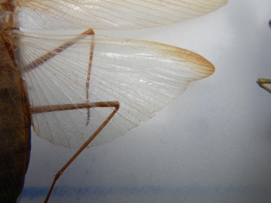 Inconfondibile per le tegmine ialine eccetto l'area costale, talvolta con riflessi argentei. Dimensioni molto piccole (maschio 58 mm).