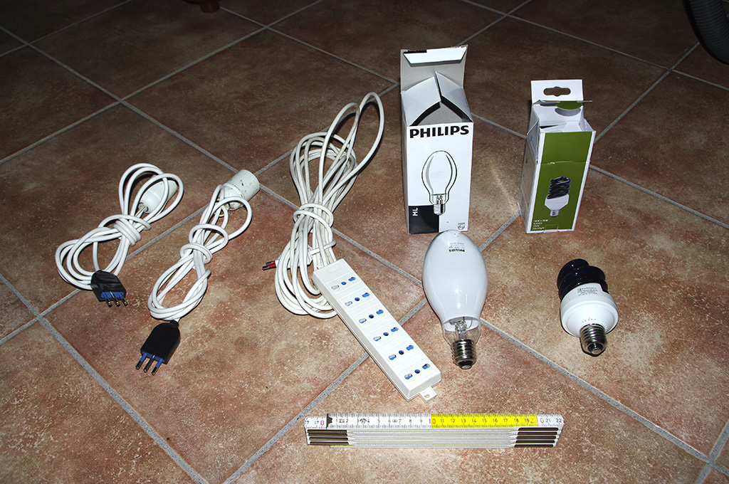 Lampade ed accessori (due cavi con spina e portalampada - autocostruiti; cavo con spina e "ciabatta" - in caso di utilizzo di due lampade, dato che il mio inverter ha una sola presa; lampada a luce mista da 160 watt e lampada fluorescente a luce nera da 15 watt)
