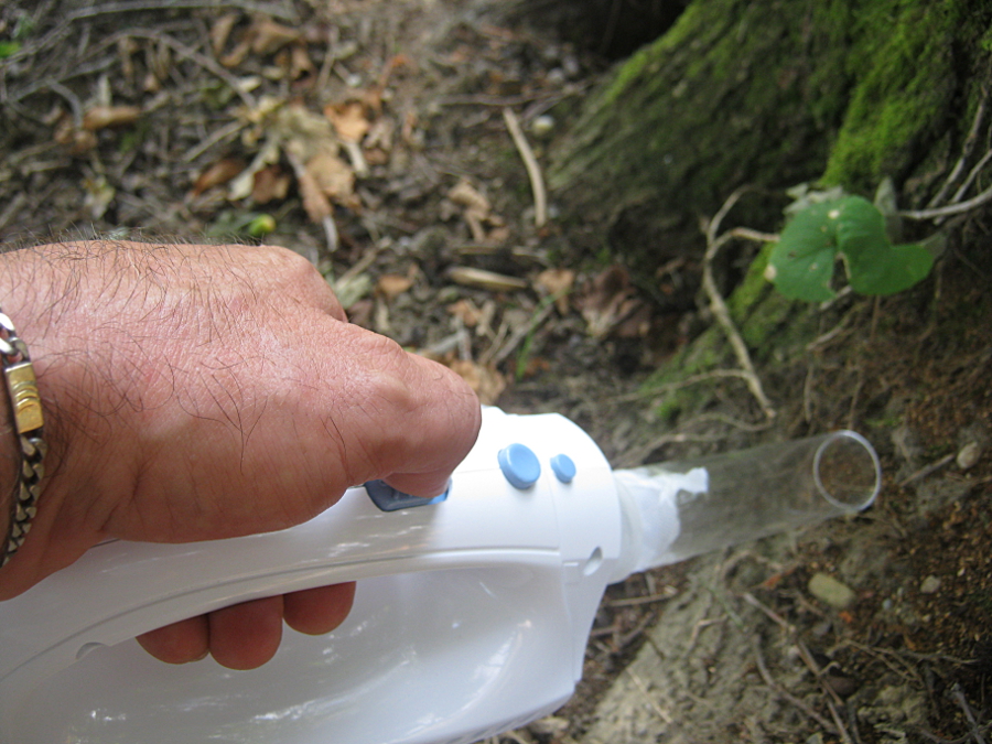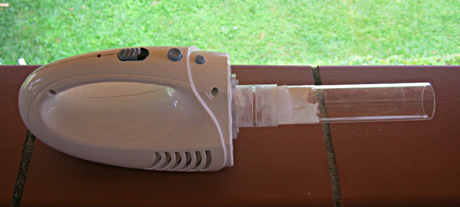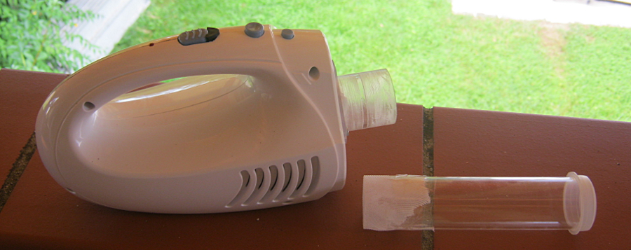 Eccolo: per ora ho aggiunto solo della tulle dal lato aspirazione, fermandola con del nastro adesivo; una volta aspirato l'insetto, un coperchietto ne impedisce la fuga.