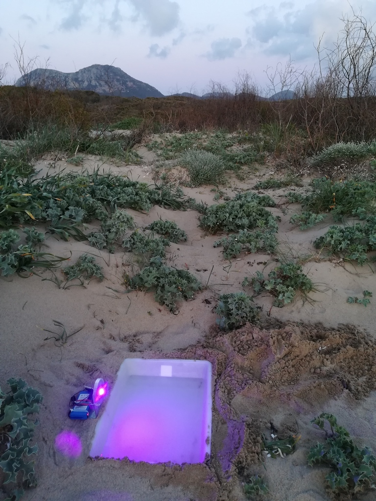 Stamattina ero sul campo per allestire qualche trappola luminosa con interruttore crepuscolare e ho fatto alcune foto. Il metodo è quello già illustrato: bacinella molto bassa interrata a filo di terra con un dito di acqua saponata; lampadina uv a fluorescenza da 20W sospesa con una bacchetta metallica infissa obliqua al suolo; batteria da 20000 mAh collegata al crepuscolare e alla lampadina. Questa l'ho montata stamattina, andrò a ritirarla domani. L'interruttore la farà accendere al crepuscolo inoltrato e la spegnerà all'alba. Ho montato il crepuscolare su un banale cardine preso in ferramenta. Da chiuso è comodo per il trasporto. Altrimenti lo si apre 90° con una pietra all'estremità per dare stabilità. O ancora lo si può aprire a 180° e un'estremità può essere infissa al suolo.