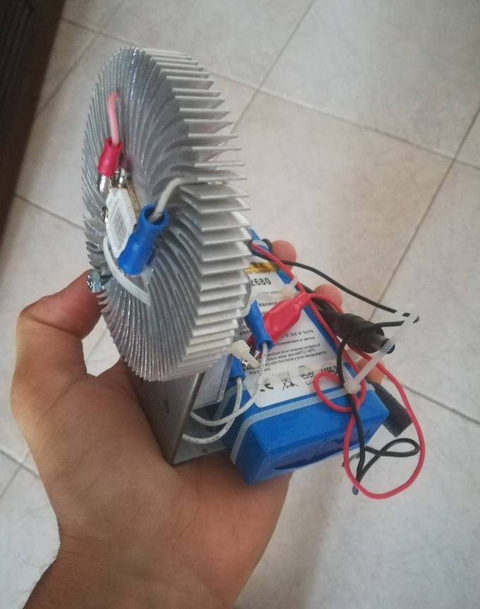Già che ci sono, vi mostro la mia ultima lampada UV, questa volta ridotta al minimo. Caratteristiche: 6W di potenza, per circa 5 ore di autonomia. Peso 138 g, dimensioni 10,5x6,3x3 cm. Ricaricabile tramite porta usb o alimentatore tra 4,5 e 6V, 0,5-1A Ho aperto il contenitore della mia prima batteria al litio 12v 6800 mAh, che dopo anni si era gonfiata e non si caricava più. Dentro ci sono tre elementi al litio, sigillati separatamente, ciascuno da 4V, 6.800 mAh. Uno era danneggiato, gonfio come un palloncino, ma gli altri due no. Ho tolto tutto il contenuto e ho usato solo un elemento, a cui ho collegato due led UV 3W in parallelo (con una resistenza per ridurre leggermente la tensione), usando interruttore e porta di collegamento elettrico già presenti sul contenitore. Il pezzo più pesante è la piastra di ferro che serve a dissipare il calore dei led, perchè al momento non ne avevo in alluminio. La luce emessa è sufficiente per i nostri scopi, se in zone con scarsa illuminazione.