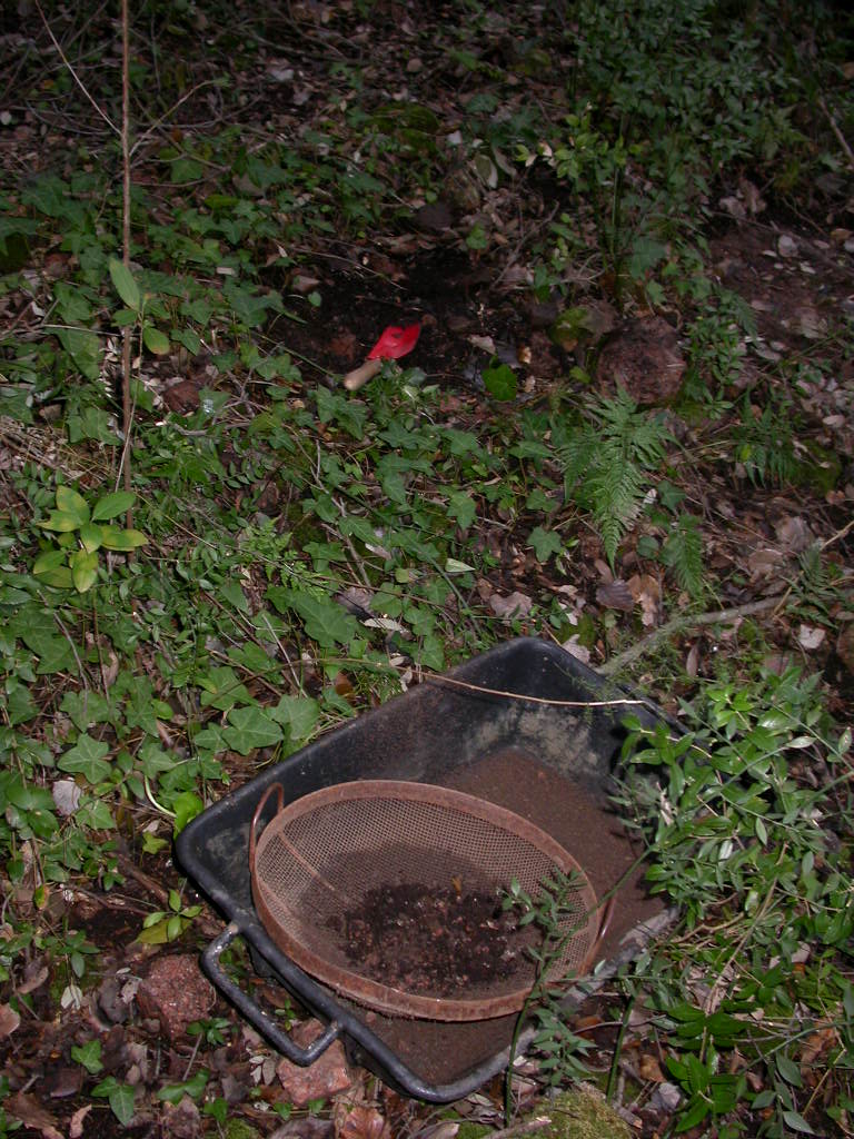 Lo scavo e il setaccio: la terra setacciata si trova dentro una madia di quelle che i muratori usano per impastare il cemento. E' ampia e abbastanza comoda: