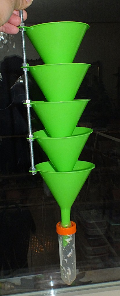 Ecco che ho combinato con i 5 imbuti da 10 cm di diametro e un pezzo di asta filettata che avevo in casa.
