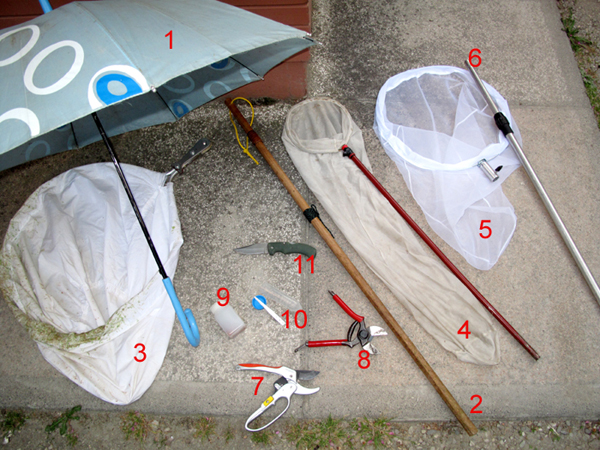 Per quanto riguarda alla raccolta con ombrello entomologico, dopo diverse esperienze, sono giunto alla conclusione che il migliore oggetto per le mie raccolte è il classico ombrello da pioggia (1).
