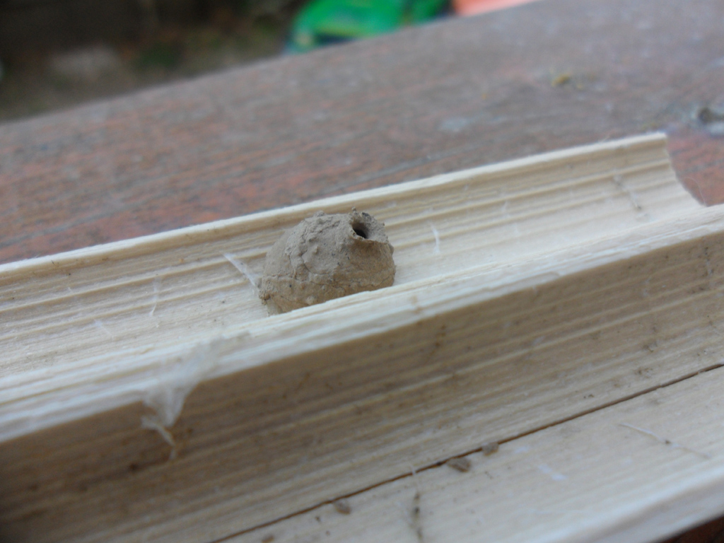 Oggi ho controllato il pezzo di canna messo in giardino e con gran stupore ho visto che è già stato utilizzato. Infatti all'interno ha creato il suo "pomo" di fango un Eumenino credo del genere Eumenes.