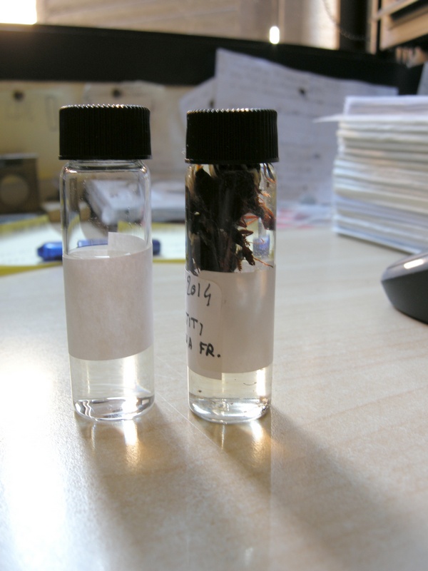 Anch'io utilizzo il metodo descritto da Maurizio: ogni sera trasferisco il contenuto di ogni singolo barattolo in buste a chiusura tipo Ziplock (anche quelle di Ikea non vanno male e costano molto meno), con carta assorbente e poche gocce di etere, ognuna debitamente etichettata con data e localitá. Tutte poi le dispongo in un contenitore termico (quelli da picnic). Al rientro, poi, con calma trasferisco tutto nella solita soluzione di alcool al 70%. Non ho mai avuto problemi facendo cosí...