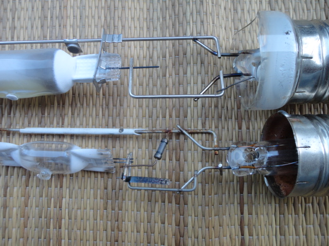4) Quarta foto evidenzia l'accenditore integrato delle lampade a vapori di mercurio (quella sorta di resistenza nera ponticellata nella lampada in basso) mentre assente nelle, ioduri metallici spesso sostituito da placca recupera elettroni come sopra.