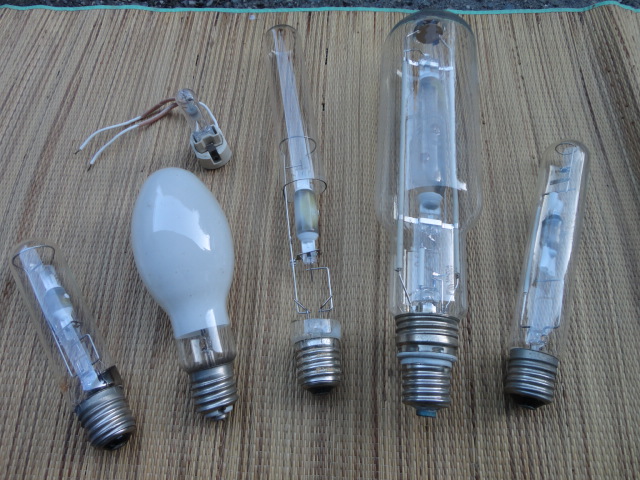 2) Nella seconda foto vengono illustrate varie lampade a ioduri metallici da 2000 wat a 35 wat con il particolare di una da 400 wat non schemata, e una da 250 wat simiile per forma e schermatura (causa elevate emissioni UV) alle vapori di mercurio esposte in precedenza... ma solitamente (non per tutti i modelli) riconoscibile dallo zoccolo in ceramica spesso abbinato all'argentatura del colletto del vetro.