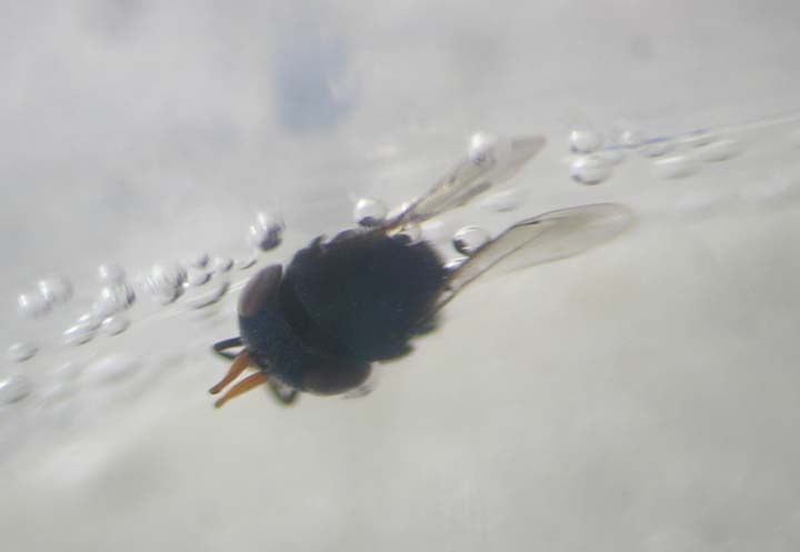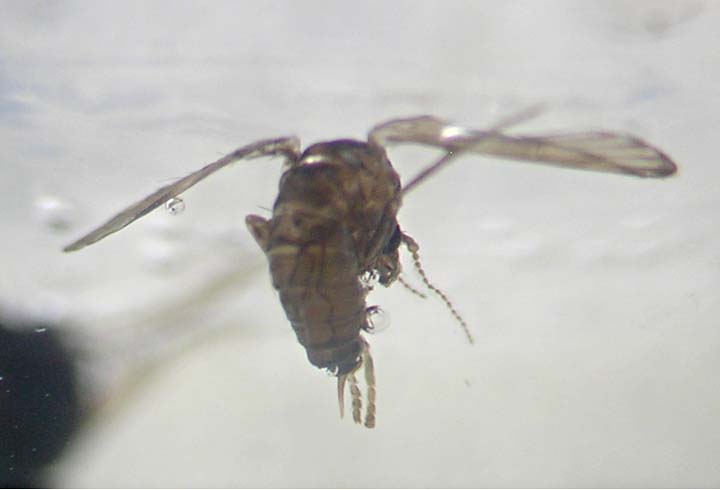 A distanza di ben tre anni, quindi perfettamente in linea con i miei tempi, ecco la mia malaise trap  , realizzata con l'aiuto di mia madre, che si è gentilmente offerta di cucire e di assemblare il tutto. I lati più lunghi misurano 140x140x90cm. I pezzi sono composti da tulle nero, con ai lati, come rinforzo, delle fettucce a cui si aggiungono dei pezzetti di velcro con cui collegare l'intera struttura ai paletti. L'innesto per il contenitore di raccolta inizialmente mi ha fatto un po' dannare, ma alla fine sono riuscito ad ottenere un raccordo abbastanza funzionale (lo scotch della foto è stato poi sostituito con un tappo, su cui si avvita il recipiente per il liquido). Naturalmente il record di Livio rimane imbattuto. Noi ci abbiamo messo poco più di tre giorni a realizzarla  ... La trappola è funzionante già da qualche settimana nell'orto di mio nonno (  ). Di tanto in tanto vado a controllare per assicurarmi che non si sa rovinata o deformata, e per sostituire il liquido. La quantità di insetti che vi cade all'interno è veramente notevole, se non impressionante. Durante l'ultimo controllo (ieri), ho riscontrato anche vari coleotteri apparentemente interessanti, per lo più nitidulidi strani, coccinellidi e per la prima volta, Corylophidae. Ovviamente non potevano mancare gli "oggetti" principali della mia ricerca in quell'ambiente, gli Psychodidi  , che purtroppo trovo sempre sporadicamente rispetto a tutti gli altri ditteri (...credo però che è solo questione di tempo  ). Stessa osservazione di Livio. Non appena l'ho piazzata ha iniziato subito a catturare  . Con buona probabilità una femmina di Clytocerus sp., Pericomini.