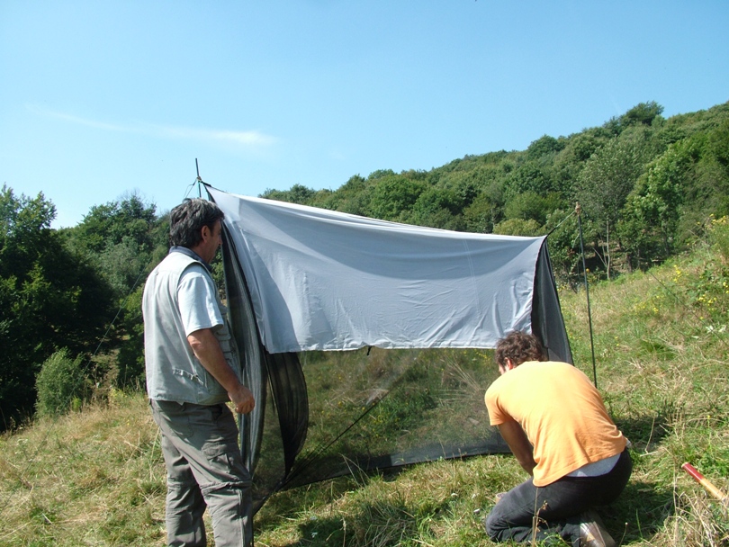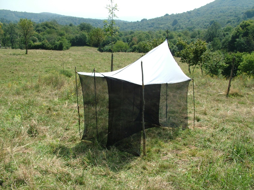 Io me l'ero costruita più o meno con quelle misure, usando per la parte inferiore del materiale sintetico di colore nero mentre per il "tetto" di colore bianco. Iniziava a catturare già mentre la installavo! Costo complessivo: circa 15 euro, più qualche accidente da parte di mia moglie (che me l'aveva poi cucita in poco meno di mezz'ora). In pratica, in poco più di tre ore la trappola era confezionata (schizzo del progetto, riporto delle misure sui tessuti, taglio dei tessuti, cucitura delle parti, rinforzo dei tenditori, applicazione del vaso di raccolta preparato qualche giorno prima). I tessuti, di colore bianco e di colore nero, li avevo acquistati, in rotoli, in un magazzino di "scampoli" qui vicino: una metratura totale sufficiente per 6-8 Malaise ad un costo totale di 20 € (l'ho poi utilizzato per altre cose, compreso i sacchi dei retini piccoli, ma ne ho ancora  ). Il prossimo inverno mi ricostruirò un paio di Malaise (questa mi era poi stata distrutta da una mandria di vacche al pascolo un paio d'anni fa ...  ). ... Salvo rimostranze della consorte!