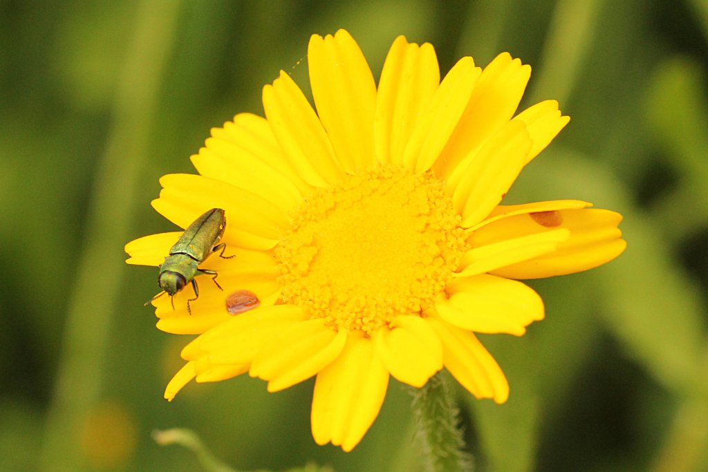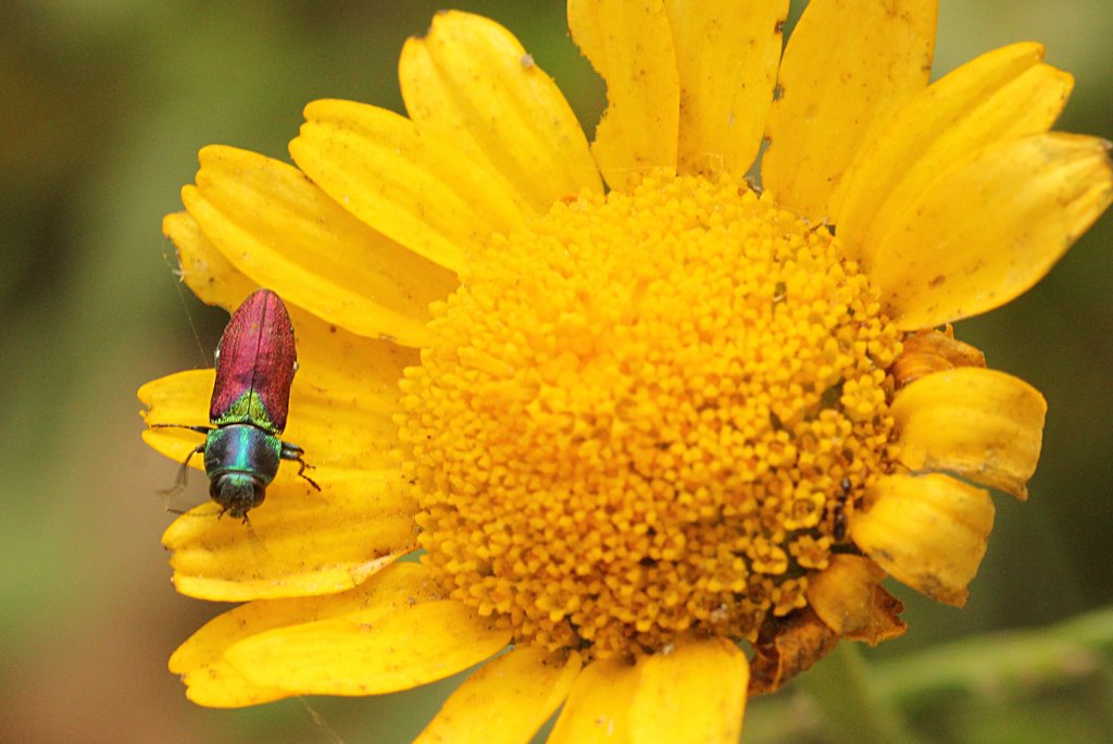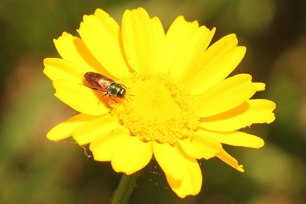 Su questa margherita sono evidenti i petali rosicchiati da qualche Buprestidae, in genere si tratta di Anthaxia, Acmaeoderella o Acmaeodera.
