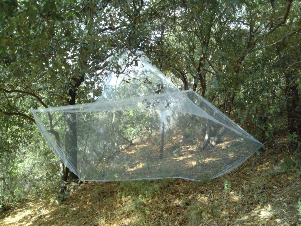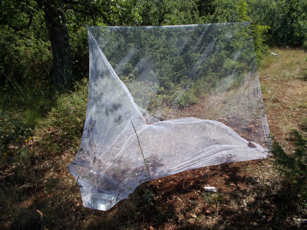 Ho pensato che una cosa del genere, se posizionata in orizzontale lungo un sentiero, invece che in verticale su un letto, potesse diventare una discreta trappola per gli insetti volanti. Tenendo il vertice sollevato, e applicandovi un contenitore con un raccordo ad L, potrebbe funzionare come una vera Malaise, per Imenotteri, Ditteri, ecc., ovvero insetti che cercano di superare l'ostacolo volando più in alto. Posta col vertice in basso, ed un contenitore pieno d'acqua sul fondo, potrebbe catturare insetti che incontrando un ostacolo tendono a scendere a terra, in particolare, Coleotteri.