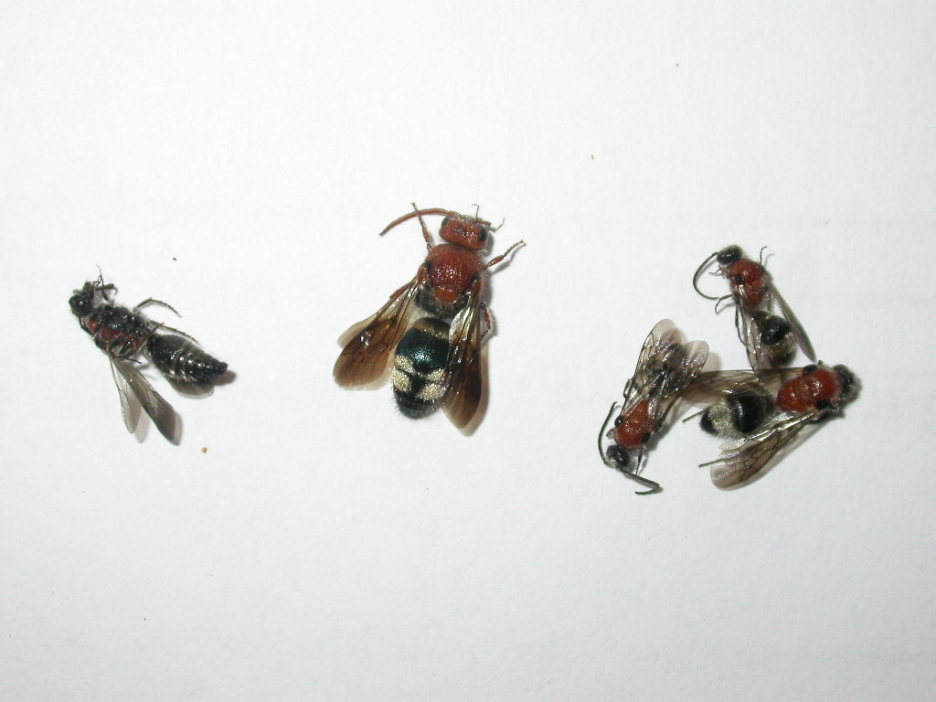 Stamattina ho dato uno sguardo alla rete, con risultati incoraggianti: un maschio di Smicromyrme perisii (a sn), uno di Mutilla quinquemaculata, purtroppo privo di un'antenna (al centro) e alcuni maschi di Smicromyrme melanolepis (a dx):