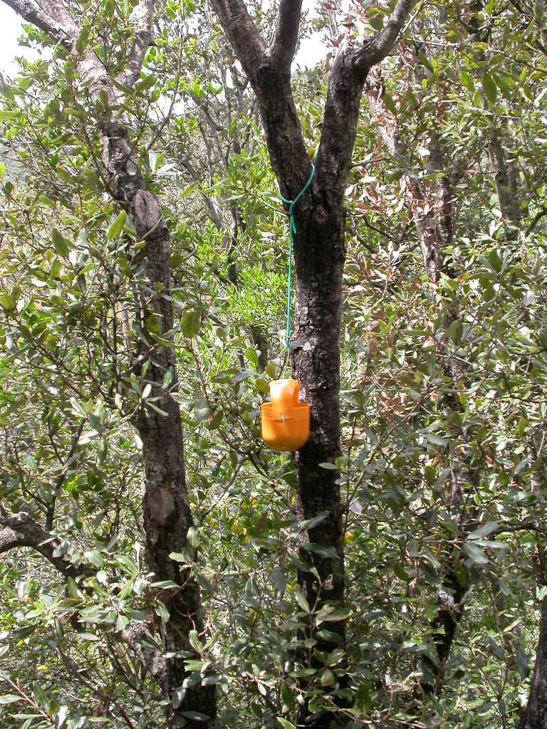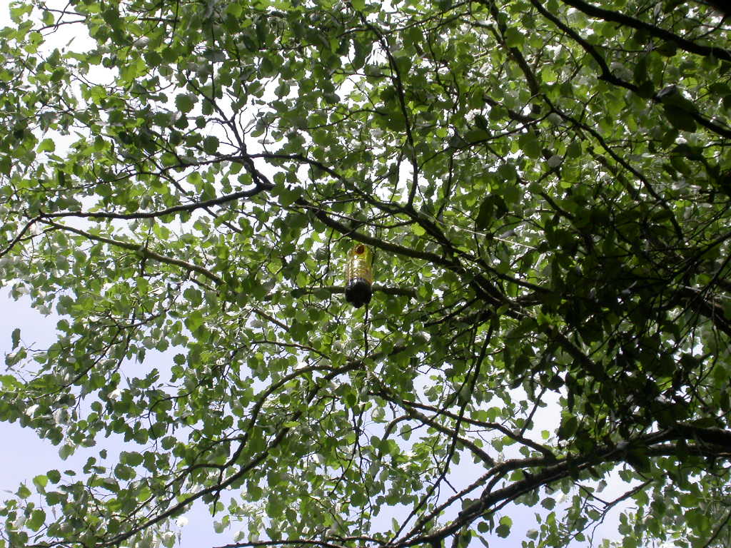 Le altre invece sono state ricavate da bottiglie di plastica di bibita. Questa è stata piazzata in bosco d’alto fusto, ai margini di un ‘buco’ tra le fronde: è a circa 25 metri di altezza. L’ho messa lassù grazie a una fionda che ha lanciato un sasso legato a del nylon da pesca: il nylon poi è stato sostituito con del comune spago da pacchi. La trappola può essere tirata giù e issata nuovamente grazie allo spago.