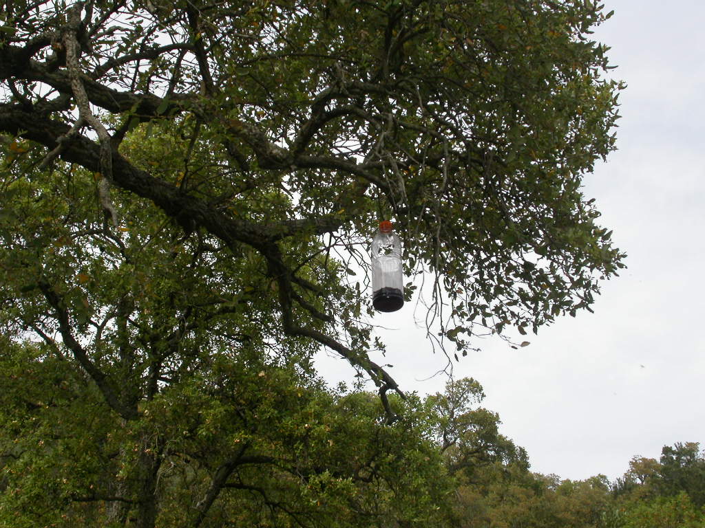 Ieri ho ritirato cinque trappole aeree a liquido, innescate a semplice vino rosso con una lieve aggiunta di sale. La stagione, almeno qui in Sardegna, è già idonea per il loro impiego. Alcune foto delle trappole, diverse per posizionamento e dimensioni: la prima è questa, ricavata dall'involucro di sorpresa di un uovo di Pasqua. E’ di piccole dimensioni ed è stata posta nel tronco di un leccio che stillava linfa e che quindi costituiva già di per sé una attrattiva per diversi insetti.