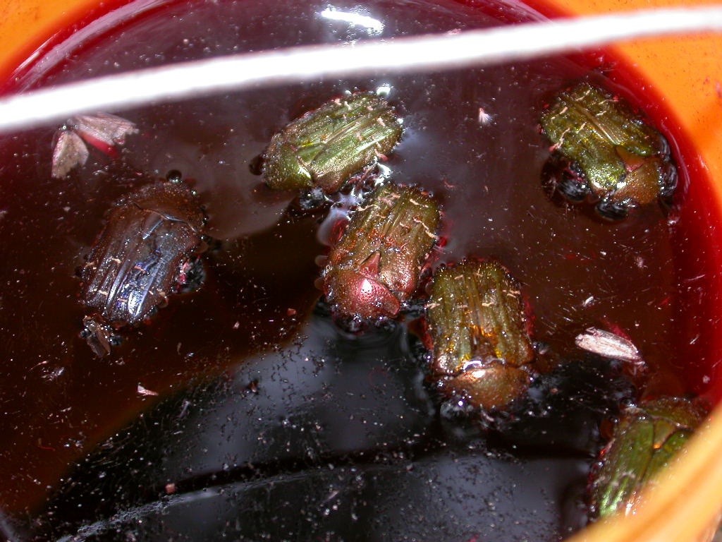 Su un totale di 5 trappole ho raccolto circa 60 Cetonia carthami: qui una foto di alcuni esemplari (il grosso lo hanno catturato le trappole più grandi).