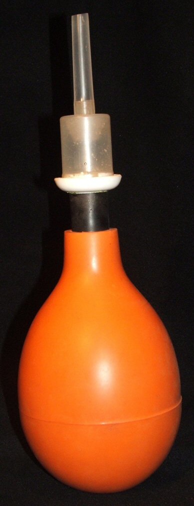 Inizialmente anch'io avevo sperimentato un modello "professionale" ma consumava un po' troppo velocemente le batterie.... A parte gli scherzi, credo che i normali aspiratori li conosciamo un po' tutti, questo che propongo, invece è una variante per i "pabulum" particolari, come sterco, carogne, ecc! Si tratta di una comune perettona per clisteri, mentre il resto è ricavato da parti di dispenser per sapone assemblati per ottenere il contenitore con canna di aspirazione.
