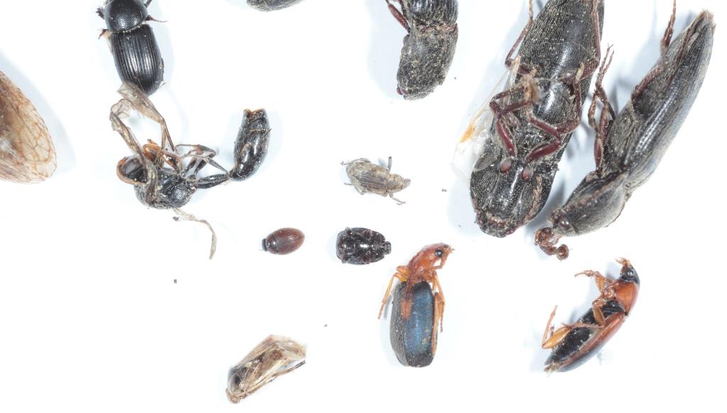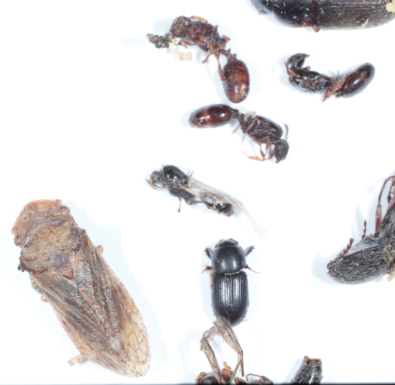 Limitandomi più che altro alle famiglie o superfamiglie: Coleotteri Elateridi, Afodiidi, Carabidi (tra cui Brachinus, forse B. sclopeta), Curculionoidei (sembrerebbe l'Eririnide Lissorhoptrus oryzophilus, un 'alieno' ormai diffuso in tutte le aree risicole italiane) e un paio di altre famiglie (forse Isteride quello capovolto); Imenotteri (anche) Formicidi; Rincoti Miridi, Cicadellidi (Ledra aurita: la cicalina grossetta e di colore nocciola, con testa larga e pronoto con 'orecchie' che si vedrebbero meglio di lato piuttosto che in visione dorsale). Per fornire le coordinate di ciascun soggetto ci vorrebbero lettere e numeri, rispettivamente, su due lati delle foto...