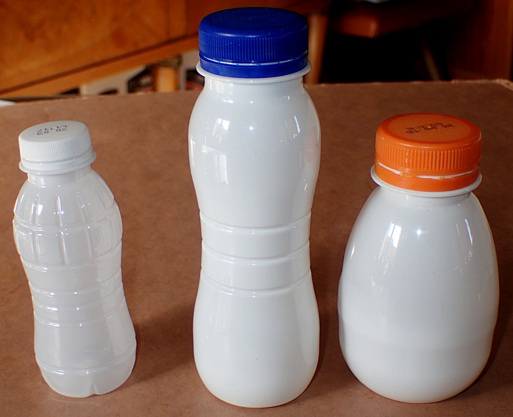 Ora, tra i barattoli "riciclati" le mie preferenze cadono su quelli degli yogurt da bere, di cui esistono vari tipi, di diverse dimensioni, come questi: