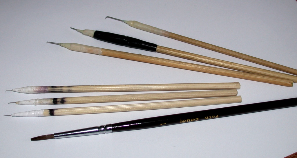 Io me ne sono fatto un set di sei diversi, tre con spilli normali (misura 2-3) e tre con microspilli; diversi per la curvatura sulla punta: dritti, curvati a uncino e piegati a gomito. Così a seconda delle dimensioni dell'insetto e delle parti da muovere posso scegliere quello che mi è più comodo.