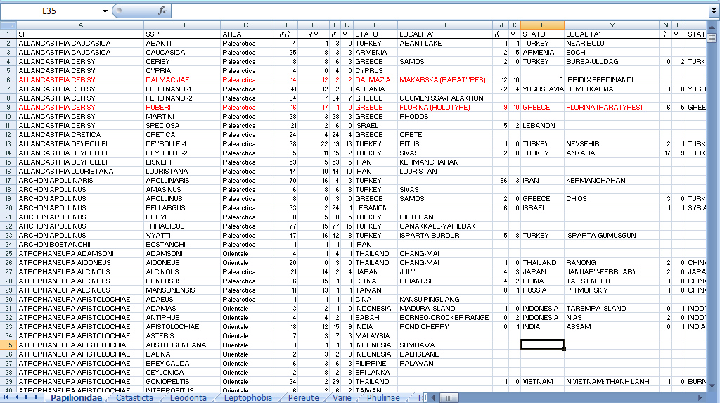 Qui di seguito inserisco una videata del mio archivio. Nella riga in alto ci sono le voci: Genere, specie, area geografica (a me serve per poter fare un eventuale sort di ciò che ho in vista di cambi o acquisizioni), totale ♂♂ e ♀♀ per ciascun taxon, e poi ♂♂ e ♀♀ per ogni località da cui ho quel taxon (fino a un massimo di 12, credo. Se aumentano le località, duplico la riga del taxon, come nel caso di Allancastria cerisy ferdinandi).