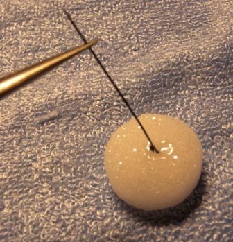Taglio ad 1/3 un cotton fioc in obliquo in modo da poterlo poi infiggere nel plastazote dell'angolo inferiore dx della scatola, quindi applico una goccia sull'estremita' di cotone