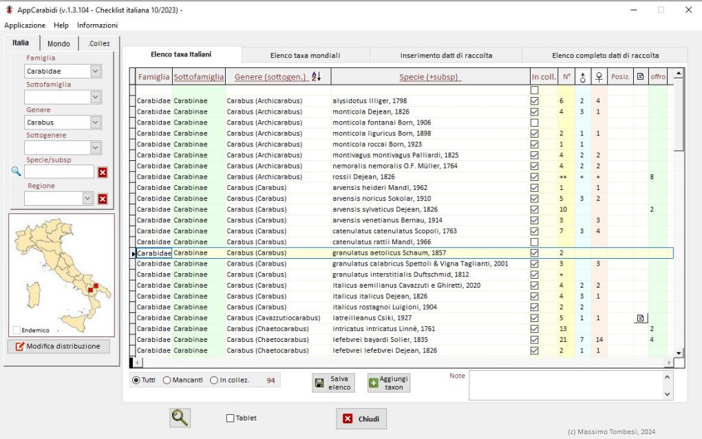 Ho visto che in passato, ma oltre 10 anni fa, si è discusso di database per la gestione della collezione entomologica. Volevo segnalare che ho realizzato un software con questo scopo, limitato ai Carabidi, basato sulla checklist italiana e su una checklist mondiale. Ho una lunga esperienza di programmazione e il software l'ho realizzato sulla base delle mie esigenze, tuttavia mi pare un lavoro che potrebbe essere utile ad altri. L'uso è molto flessibile: va bene per mantenere il semplice elenco delle specie possedute (con numero e suddivisione in sesso), i taxa disponibili per scambi, la posizione in cassette eventualmente numerate. Permette la visualizzazione filtrata (filtri multipli e simultanei: per sottofamiglia, genere, sottogenere, presenza o mancanza nella collezione, e molto altro) e mostra per i Carabidi italiani la distribuzione per regioni. Per ogni taxon è possibile l'inserimento di un link a documenti da allegare (pdf, immagini, o altro). La lista dei taxa può essere aggiornata dall'utente con nuovi inserimenti o correzioni. Si possono produrre mancoliste, anche suddivise per generi, oppure liste di offerte. E' possibile inserire i dati di cattura per ciascuna specie, e dall'inserimento di questi, procedere direttamente alla stampa dei cartellini a corredo degli esemplari. Le funzioni sono veramente molte; ha un help contestuale in linea e una procedura che segnala la disponibilità di aggiornamenti, scaricabili dal web. L'ho testato con qualche collega per alcuni mesi, e oramai gli errori rilevati sono minori e rari. Mi limito a postare solo un paio di schermate; chi fosse interessato trova una dettagliata ed esaustiva descrizione sul sito web che ho appositamente creato per documentazione https://www.carabidi.itIl software è gratuito, aggiornabile, e il file per l'installazione è liberamente scaricabile. Il "motore" che ho progettato ed è alla base del gestionale, potrebbe gestire eventualmente checklist di altre famiglie, avendo i dati con un tracciato record adatto (e con un discreto lavoro da parte mia).