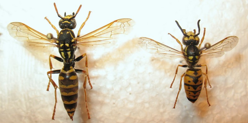 A sinistra un (grosso) Polistes, a destra una Vespula. (Intanto vedi un buon esempio di preparazione!)