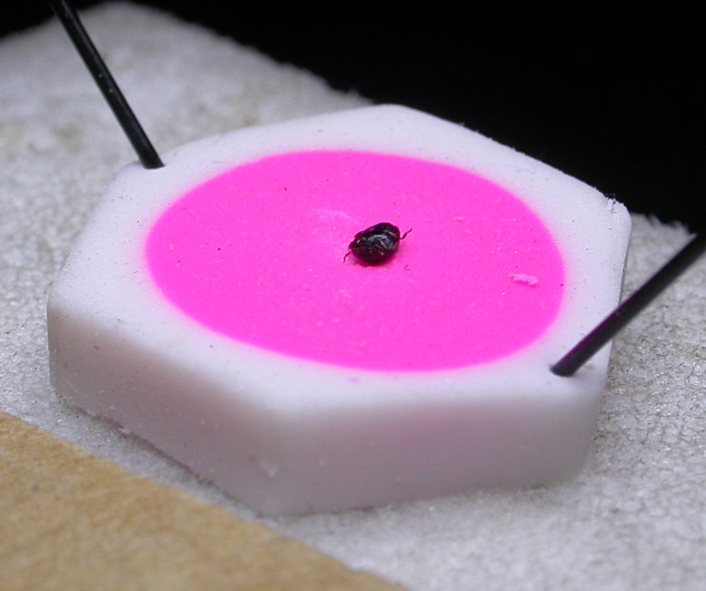 Ho finalmente provato la tecnica della gomma con la fossetta per preparare gli insetti piccoli e convessi, che è difficilissimo tenere fermi e rivoltati mentre si distendono zampe ed antenne. La gomma è rosa acceso e il foro l'ho fatto con la punta diunpiccolo cacciavite, ma funziona ugualmente. Ho provato con uno Scymnus di 2 mm che mi stava facendo impazzire da 10 minuti, e con questo sistema in un attimo sono riuscito a distendere le appendici! E senza che schizzasse via, perdendosi nel mare magnum della mia scrivania!