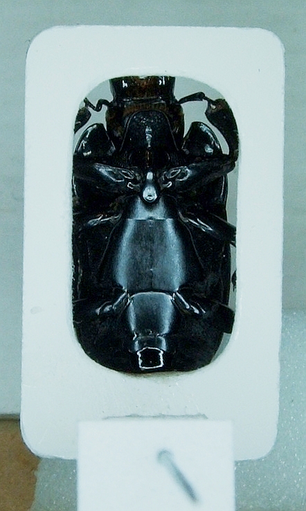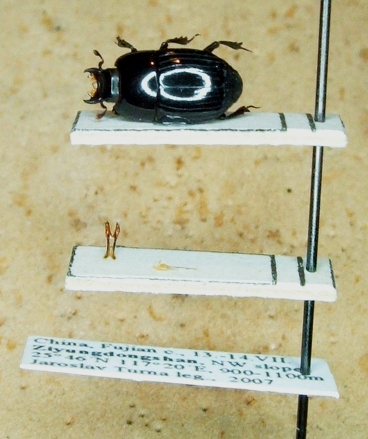 Io personalmente addotto tutte e due le soluzioni: se gli esemplari non sono troppo grandi, su di un fianco. Con quelli di dimensioni maggiori (es. Pactolinus (!), Pachylister, ecc.) cartellino forato. :o