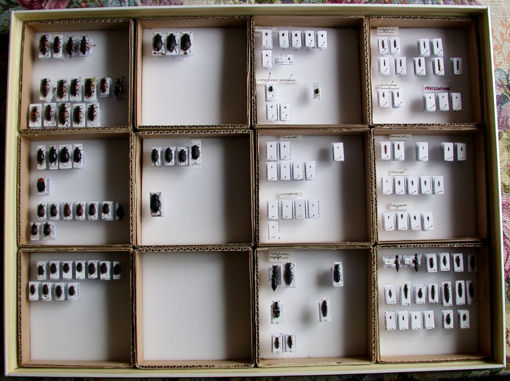 Se le scatoline interne non sono alte proprio come la scatola esterna, non è un problema. Possono essere anche 1 cm più basse e non possono spostarsi comunque. Al massimo, se sono un po' lente, possono venire un po' avanti, ma quando prendi la scatola e la metti in orizzontale tornano a posto. Quelle che ti sei fatto da solo hanno, secondo me, un solo problema: essere fatte in cartone ondulato. Per gli antreni non c'è nascondiglio migliore. O le foderi in carta (bianca, sarebbe meglio) o le fai direttamente in cartoncino compatto. Detto questo, sono d'accordo con voi che è un sistema più pratico per la facilità con cui si risistemano gli esemplari nelle scatole. Non lo trovo altrettanto pratico per l'osservazione al binoculare, perchè spesso bisogna osservare gli esemplari di lato, frontalmente o di sotto, per cui bisogna comunque osservarli singolarmente dopo averli tolti dalla scatola (o dalla scatoletta). Personalmente, pur conoscendole da molti anni, in seguito ai mei contatti con entomologi americani, non le ho mai adottate, per due motivi: 1 - la mia collezione principale comprende Buprestidi di tutto il mondo, per cui si va da cosini minuscoli di 1,5 mm a bestioni di 7 cm ed oltre. Per i primi le scatolette interne andrebbero bene, ma per i secondi assolutamente no. E sistemare parte della collezione in un modo e parte in un altro mi piaceva poco. 2 - in realtà a me servono meno che a molti altri entomologi, visto che per motivi di spazio ho quasi tutte le cassette sistemate tipo libro su piani orizzontali che ricoprono le pareti fin quasi al soffitto, e dopo un periodo iniziali con cassette standard, o anche più grandi (ora utilizzate per parte della collezione generale), ora ho tutti i Buprestidi in cassette a mezza misura, che trovo più pratiche da sistemare e da maneggiare, e che riducono molto anche il problema degli spostamenti degli insetti. Un "difetto" del sistema a scomparti interni è che rende necessario, per lo stesso numero di esemplari, l'uso di parecchie cassette in più, con occupazione di più spazio in casa, e con maggiori spese (a cui si aggiunge la spesa delle cassettine interne, se non ce le si fà da soli) |
