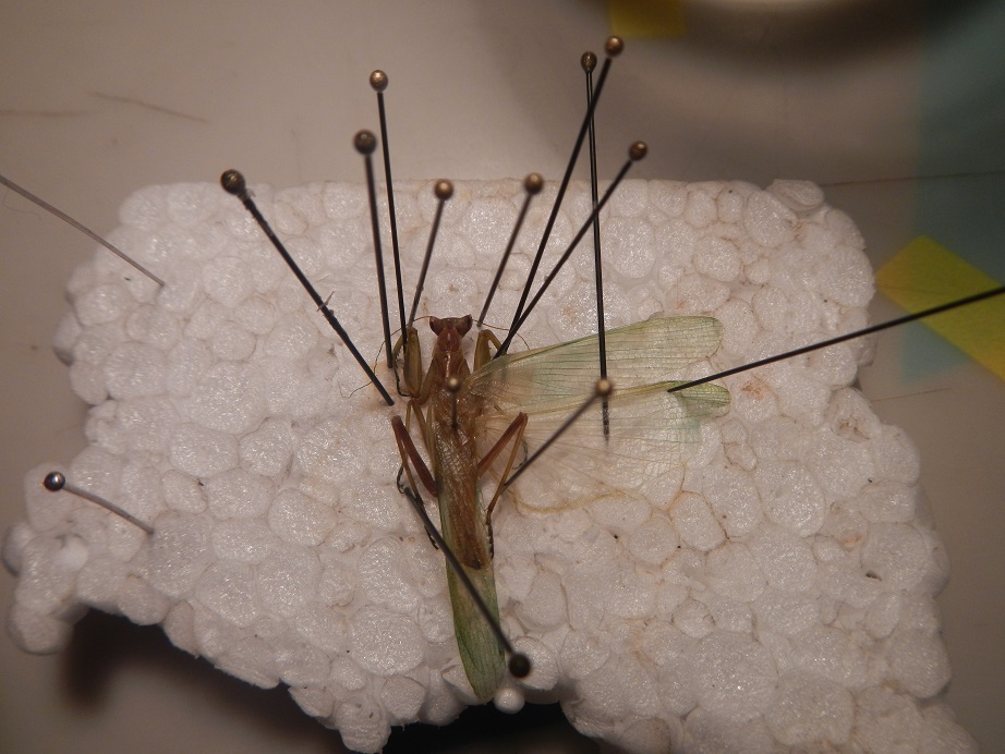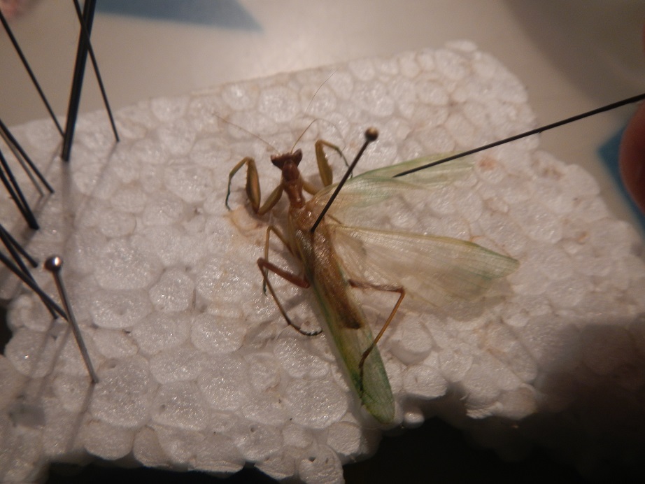 anche io sono un appassionato di conservazione a secco, ma ho notato subito la foto nella quale prepari la mantide spillando l'ala. io onestamente non ho mai visto fare quel lavoro con qualsiasi tipo di ala. credo che il procedimento sia simile a quello delle farfalle (nonostante le ali siano più robuste). io ho sempre usato un foglio di carta trasparente lucida dalle dimensioni leggermente più grandi dell'ala, per fissare questa senza danneggiarla o bucarla. ciao ciao