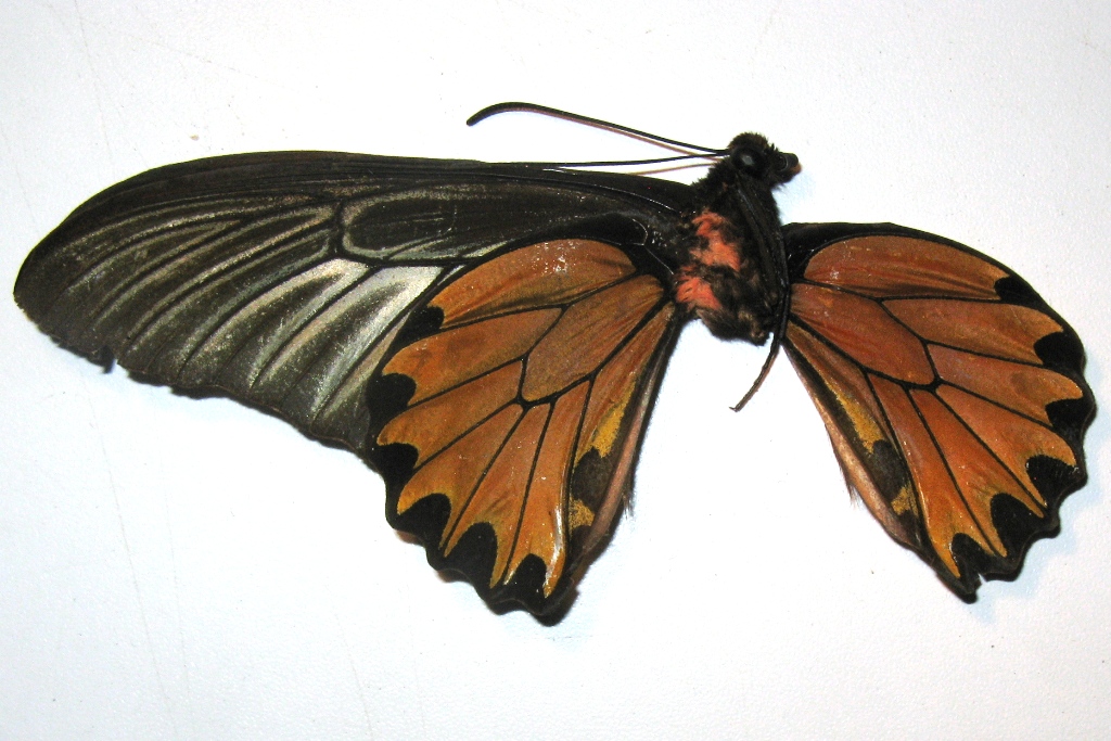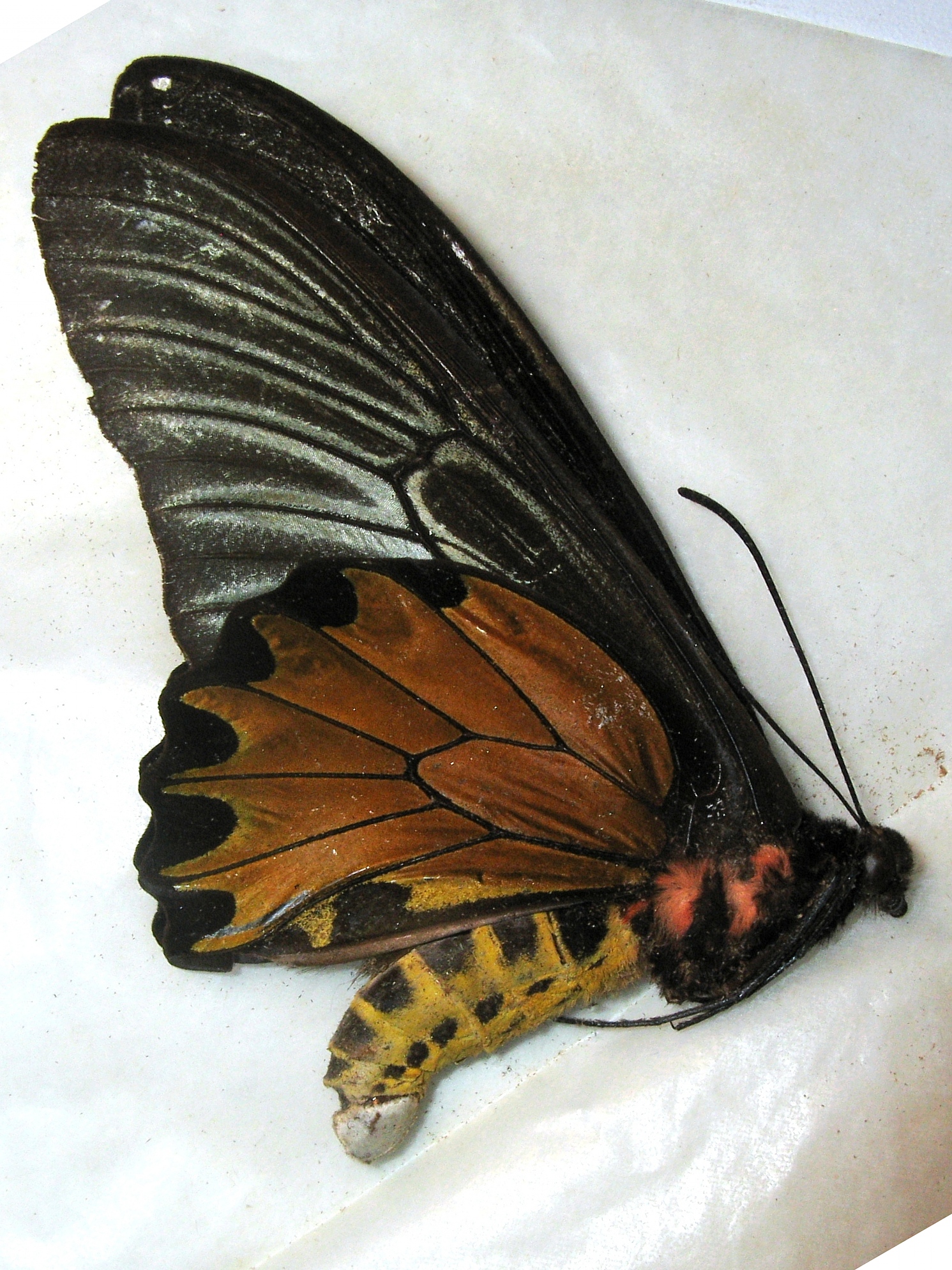 Salve a tutti. Mi trovo di fronte a questo esemplare di Troides con le ali molto inscurite per qualche motivo a me ignoto. Volevo chiedere se c'era un modo per far tornare il bel giallo di queste bellissime farfalle. - Il solito bagno in benzina che uso quando ho dei lepidotteri "ingrassati" può funzionare? Non mi sembra che sia il grasso ad aver alterato il colore però - E' meglio un trattamento diverso? - o non c'è nulla da fare? ps: dovrebbe essere un maschio di Troides aeacus formosanus di Taiwan