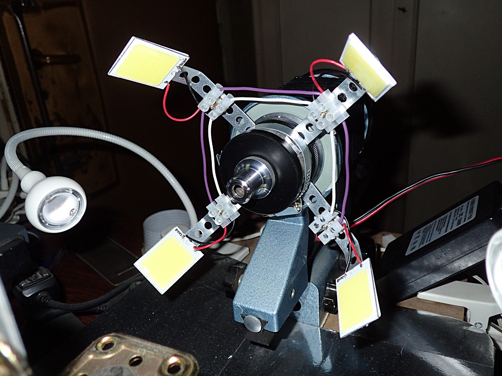 Recentemente ho provato ad usare una illuminazione, quando fotografo con gli obiettivi da microscopio, quindi ad ingrandimenti da circa 3x in su, costituita, invece che dai due faretti LED Ikea Jansio che uso normalmente, da 4 LED COB rettangolari dati per 8W, come questi. Fanno una gran bella luce, sono adesivi, quindi si montano facilmente su un qualsiasi supporto, non scaldano praticamente per niente, e quindi non necessitano di dissipatore di calore, ed emettono una luce già abbastanza diffusa. Ed infine costano pochissimo (e si possono alimentare direttamente con un qualunque alimentatore o batteria a 12V DC - hanno già un piccolo limitatore di corrente incorporato).