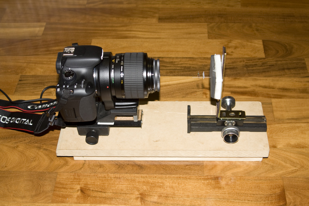 Entomarci ha scritto: L'argomento mi interessa molto percheè devo imbastire una postazione per macrofotografie. Al momento dispongo della macchina e del giusto obiettivo ma non ho alcuna idea su come realizzare la parte relativa alla illuminazione, e mi intendo della cosa come di fisica quantistica. Potrei vedere delle immagini relative a come è stato imbastito il sistema di illuminazione, sia a led che a fluorescenza per piacere? Seconda richiesta: potreste dirmi dei link su dove trovare entrambi i tipi di prodotti online? Grazie mille! Ciao. Ti allego la foto del mio cosiddetto "set": Gli illuminatori (si tratta esattamente degli anulari indicati da Maurizio su eBay, a sinistra quello a 64 LED dotato di dimmer, a destra quello a fluorescenza) sono staccati dall'obiettivo per far vedere l'anello di raccordo scanalato entro cui si fissano le tre viti presenti negli illuminatori stessi. L'anello è fornito con gli illuminatori, ma ha un passo da microscopio, non da obiettivo, per cui è necessario reperire un secondo anello di raccordo verso l'obiettivo. Fondamentale lo scatto flessibile. Oppure, come nel caso delle Canon EOS, il Live View, davvero incredibile. Nel set ho posizionato il sistema fotocamera|obiettivo su una staffa micrometrica (proprio come questa, che fra l'altro sono in realtà 2 staffe indipendenti) e l'esemplare su una seconda staffa regolabile (nel mio caso l'ho ricavata da un vecchio soffietto): . Questo è un set molto artigianale ma anche molto compatto e almeno per me ha i giusti gradi di libertà.