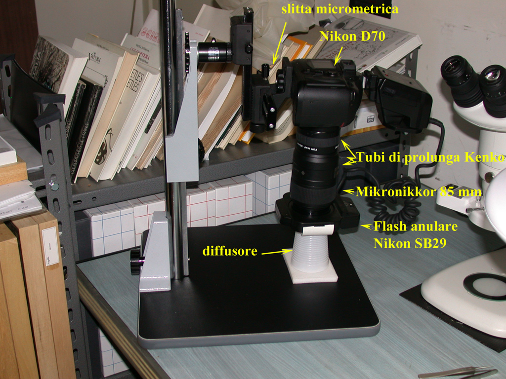 Molti amici mi hanno chiesto come ottengo le foto che inserisco nel forum. Nessuna attrezzatura spaziale, o tecniche da R.I.S. Solo pazienza (ho lottato e sofferto oltre sei mesi per raggiungere dei risultati accettabili) e la fortuna di possedere una attrezzatura di buon livello (ma accessibile a tutti), e neanche di ultima generazione. Senza dilungarmi in descrizioni, allego una foto del mio banco fotografico.