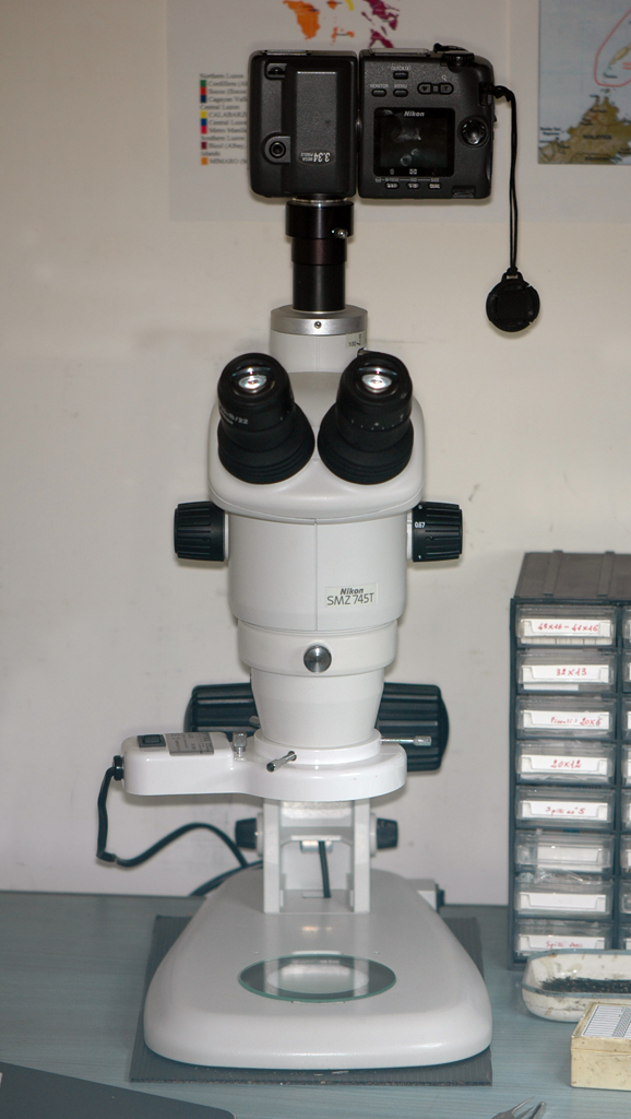 Questa, invece, è l'attrezzatura con cui faccio le foto dei genitali o dei particolari degli esemplari. Uso una vecchia Nikon Coolpix 995 da 3,3 Megapixel montata sul terzo oculare di un Nikon SMZ 745T. Come fonte di illuminazione, utilizzo il solo illuminatore anulare montato sull'obiettivo, o, in combinazione, l'illuminatore a led in dotazione al microscopio.