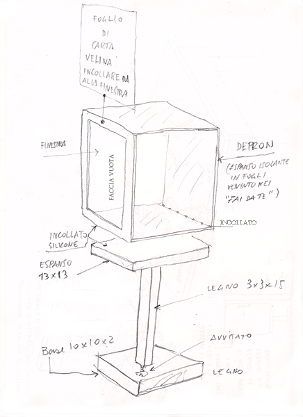Fai una scatoletta a cubo di 15 cm di lato.Incolli le facce del cubo. Sul lato sinistro apri una finestra di circa 13x13 ritagliata col cutterino.