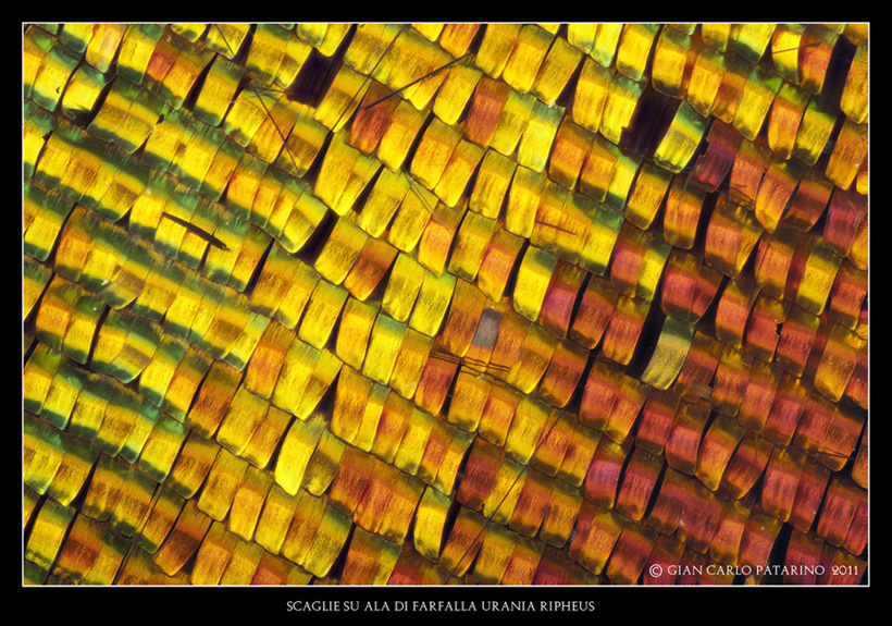 Scaglie di ala di farfalla: Nikon D90, Micronikkor 200 f/4 AFD + Nikkor CFI60 Plan 10X, FOV: 2,4, Ingrandimento sul sensore 10X circa, 85 scatti elaborati in ZS.