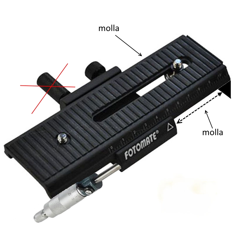 Dall'altro lato, dovresti fissare una piastrina metallica all'estremità della slitta, in modo che sporga di circa 1 cm verso il basso, fare due fori presso gli angoli della piastrina e metterci due viti con la testa verso l'esterno e sporgenti verso l'interno. Stessa cosa dovresti fare sul lato della base opposto a dove c'è il micrometro (con un'altra piastrina o trovando comunque il modo di fissarci due parti metalliche sporgenti allineate con le due viti di cui sopra. Lì dovresti metterci due molle che serviranno a mantenere in tensione la slitta e a fare in modo che si muova sia in un senso che nell'altro seguendo gli spostamenti del micrometro.