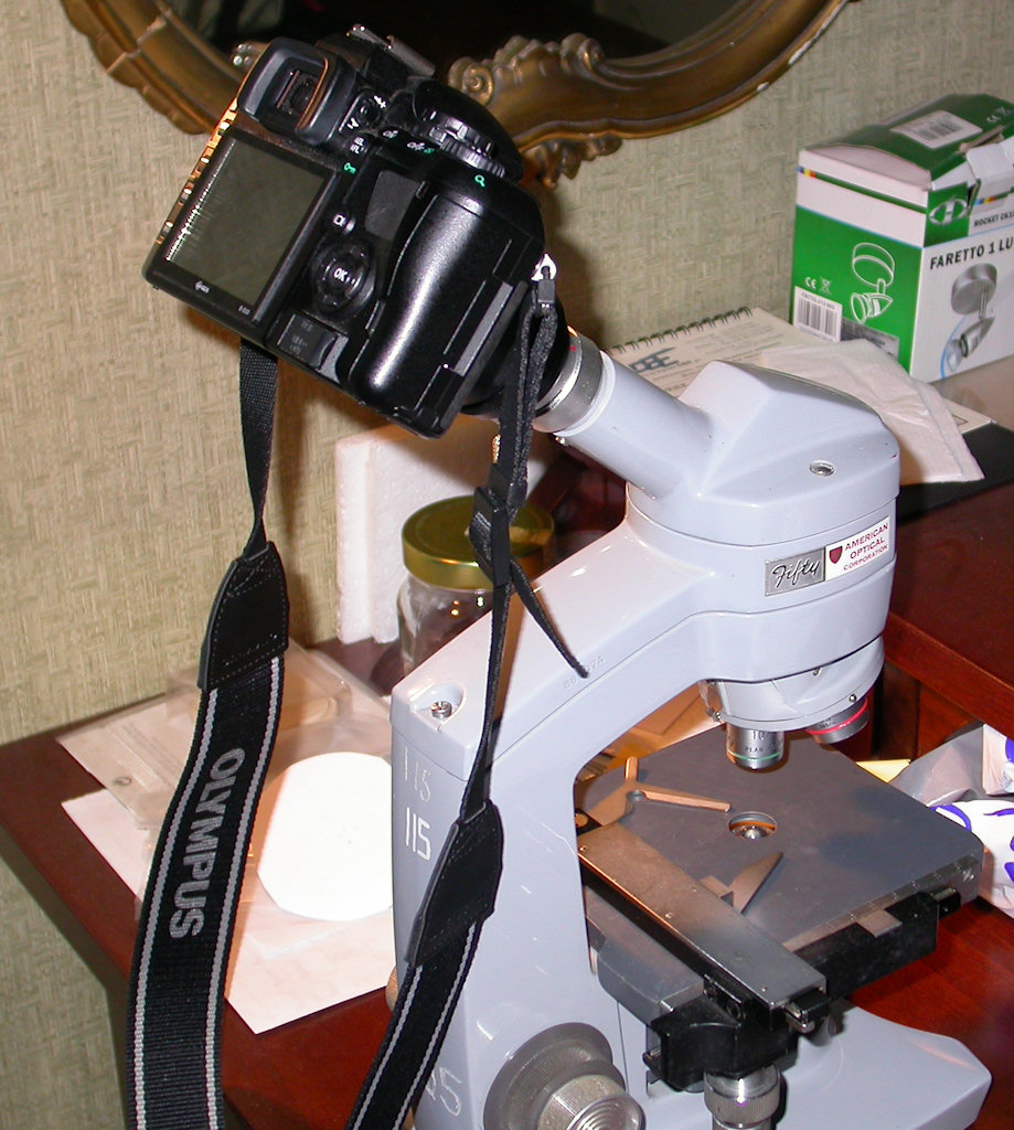 togliendo l'obiettivo alla reflex, basta un tubo che si fissi da una parte al microscopio, al tubo porta-oculare, al posto dell'oculare stesso, e dall'altra al posto dell'obiettivo della reflex). Se ne trovano già a partire da circa 15 euro, e non avendo ottica non c'è il richio che peggiorino l'immagine per la cattiva qualità di questa.