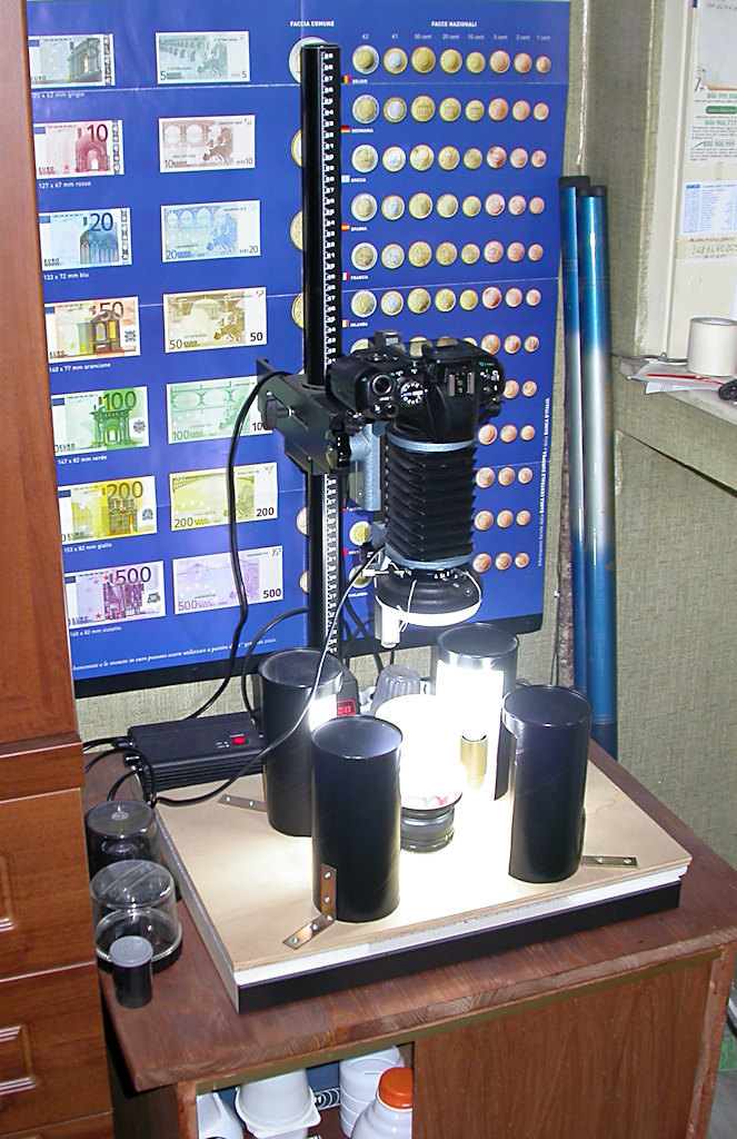 Altra cosa importante: tutto l'armamentario deve poggiare su una base solida, pesante e che non si muova (quel mobiletto basso su cui poggia il mio stativo l'ho fatto apposta tutto in truciolato pesante, con in più ulteriori spessori nella base (dove inoltre ho messo dozzine di obiettivi ed accessori, un microscopio che peserà 8 chili, ecc.). Se la base non è perfettamente stabile, tutto il risultato viene compromesso. Così posso anche permettermi di scattare le foto senza scatto a distanza.