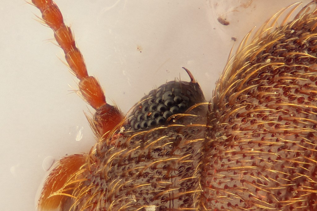 Rispetto al Nikon E-Plan mi pare che sia leggermente meno nitido, ma di un'inezia (intendo le foto fatte con la mia macchina, non quelle di Andrea). In compenso non ha aberrazione cromatica. altrimenti si sarebbe vista subito sul margine dell'occhio e soprattutto su quyella specie di grossa setola uncinata alla base dello stesso. A proposito, l'insetto completo è meno di 2,5 mm, quindi la parte visibile nella foto completa sarà intorno a 1 mm (e quindi un campo inquadrato di meno di 2 mm). La lunghezza del soffietto 160-170 mm.