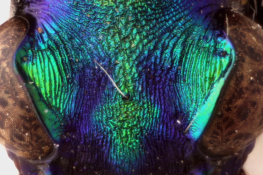 Visto che si parlava di macro oltre il 5x fatte in economia, ecco un esempio fatto di corsa della fronte di una Cicindela fotografata usando un Kaginon 50/3.5 da ingranditore con attacco a vite Leica 39x1, montato con adattatore 42->39 su un soffietto Pentacon M42 (quello a cui ho messo un link in questa discussione).