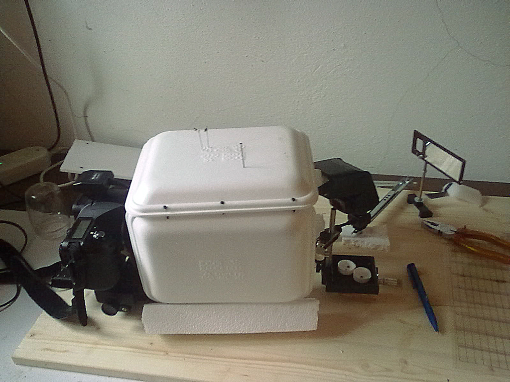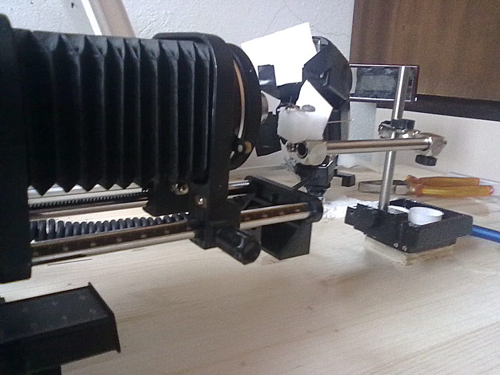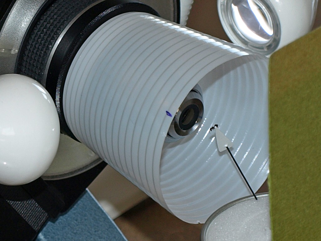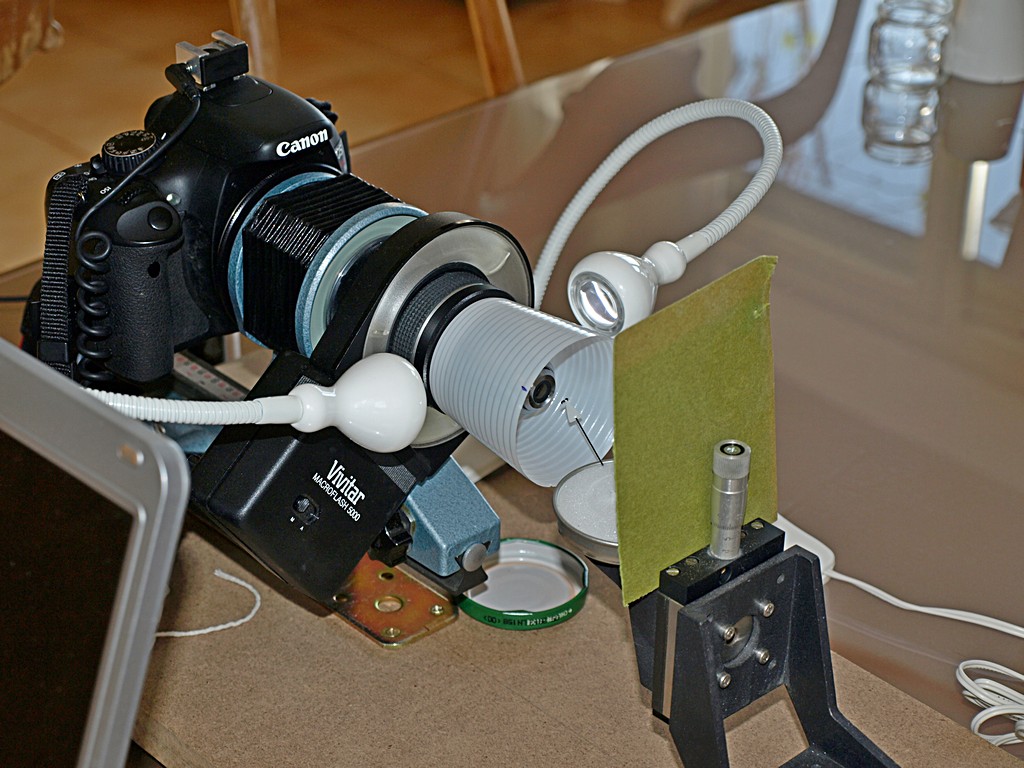 qui invece si vede il braccetto montato sul micrometro a cui è attaccato l' insetto ed il pezzetto di carta (troppo piccolo per questo soggetto) che scherma la lice diretta.