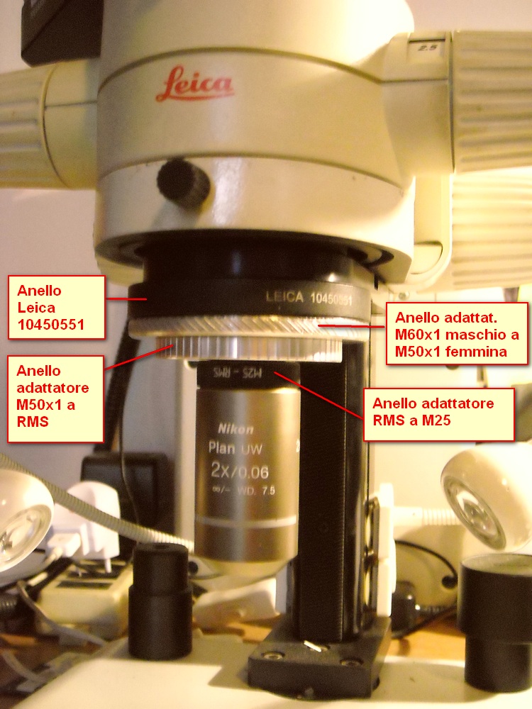 Riguardo alla compatibilità con i modelli Leica MS5, MZ6, MZ7 tutto dipende da come è progettata la slitta. Se tale pezzo si interpone tra il corpo del microscopio e il suo supporto non c'è speranza. Se, invece, sfrutta il filetto di alloggiamento dell'obiettivo allora, per i modelli Leica sopraddetti, la cosa è possibile. I microscopi Wild M3B, M3C e M3Z montano un obiettivo con filetto metrico M50 mm x 1 mm (speciale), come pure i modelli Leica MS5, MZ6, MZ7. Tuttavia non si tratta di un filetto M50x1 standard ma appositamente speciale per non essere riprodotto. Sono poche le ditte autorizzate da Leica che possono riprodurlo. Conosco bene la produzione del bravo Adriano Lolli, tuttavia lui non è in grado di riprodurre quel tipo di filetto. Ho acquistato da lui un anello adattatore per montare sul microscopio di casa (Leica MS5) obiettivi con il passo M60x1 e, putroppo, il filetto maschio M50x1 non è compatibile. Ho dovuto acquistare, svenandomi, l'anello adattore Leica 10450551 e così la cosa ha funzionato. Peraltro questo anello ha il passo femmina M60x1 di tipo standard, non speciale quindi, e consente per esempio con un banale adattore filettato maschio M60x1 e femmina RMS di poter montare gli obiettivi per microscopio biologico corretti all'infinito. In pratica con la slitta che permette la visione assiale e l'adattattore per obiettivi RMS corretti all'infinito si possono trasformare tutti quei modelli di microscopi Wild/Leica nel mitico microscopio Wild Kombistereo. A detta di molti il Santo Graal dei microscopi stereoscopici.