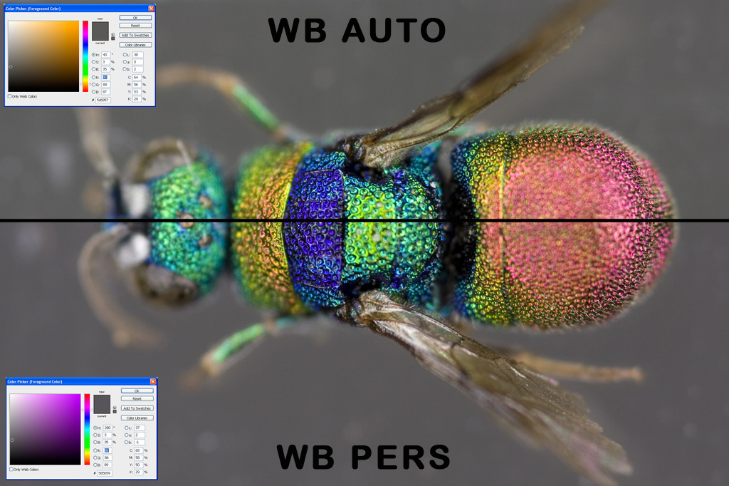 Stavolta ho messo sotto i riflettori sfondi diversi e diversi bilanciamenti del bianco (WB). Il bilanciamento del bianco personalizzato l'ho ottenuto fotografando il cartoncino grigio al 18% all'ingrandimento e con l'illuminazione di lavoro e imponendo alla fotocamera di usare quell'immagine per bilanciare il bianco.