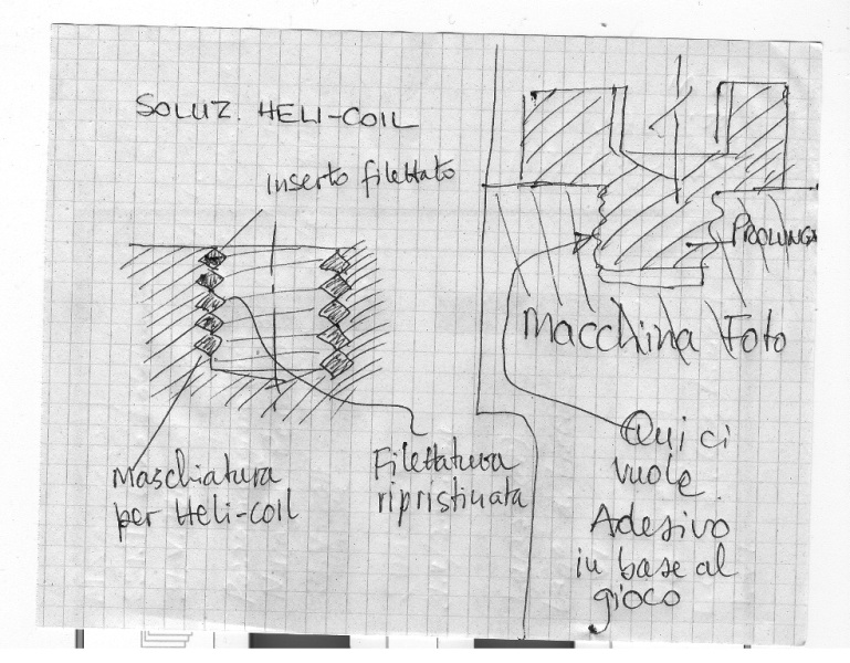 Calogero, Il problema è che quel filetto NON è una misura delle nostre: si tratta, salvo errore, di 1/4 di pollice di diametro e 24 filetti per pollice come passo. Una cosa che si potrebbe fare, ma ci vuole un buon meccanico, è di far fare nel fondello macchina una apposita maschiatura per filetto riportato (si chiama tecnicamente heli-coil) che una volta montato in sede ripristina perfettamente la situazione originale. Non è una cosa ovvia, purtroppo, perchè ci vuole un utensile maschiatore apposta ed un filetto riportatao della giusta dimensione. Altrimenti bisogna farsi costruire una prolunga vite/madrevite, la cui vite va avvitata in sede (lasca, in quanto consumata) inframmettendo un qualche adesivo: se è poco lasca (cioè il filetto ci balla appena, tipo 0,1 mm di gioco) va benissimo la loctite raccomandata dall'altro Augusto. Altrimenti se, come temo, è proprio spanata davvero, ti ci vuole un adesivo strutturale, del genere metallo liquido Bostik o UHU Technic. Naturalmente, una volta inserita la prolunga con l'adesivo (o con la Loctite) questo collegamento non si smonta mai più e bisogna vivere con quella prolunghina sempre attaccata. E' un ragionamento un po' confuso. Ti mando uno schizzetto delle due possibilità. PS: è chiaro che agli Augusti, la meccanica piace! Ovviamente si può attaccare direttamente il piede del cavalletto, bloccando la vite nello stesso modo alla macchina (in questo caso userei senza dubbio l'adesivo strutturale). Naturalmente ti dovrai portare in giro la testina del cavalletto sino a quando userai la macchina...