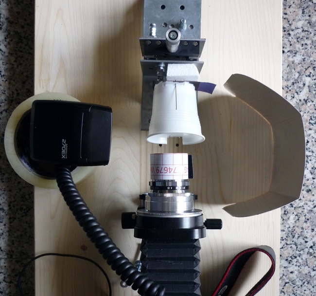 Ecco come erano disposti flash e pannellino nella prima foto (non fate caso al bicchierino, c'era della carta velina)